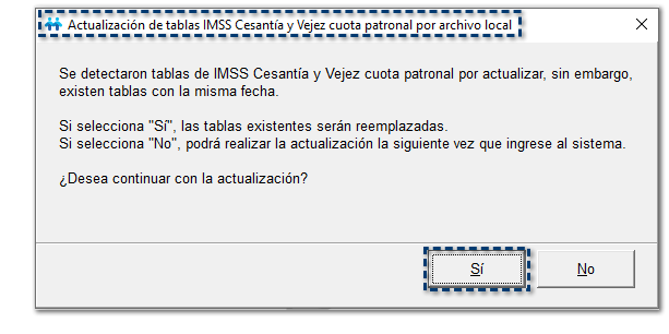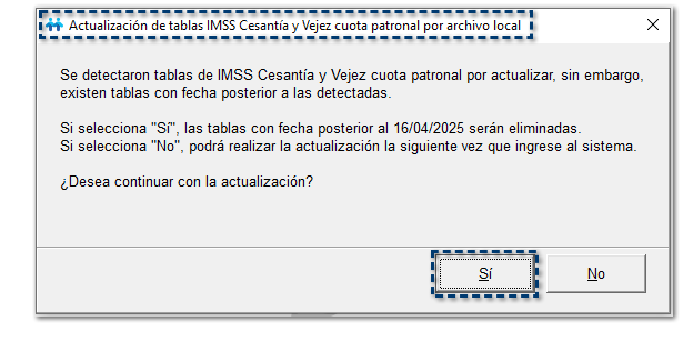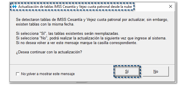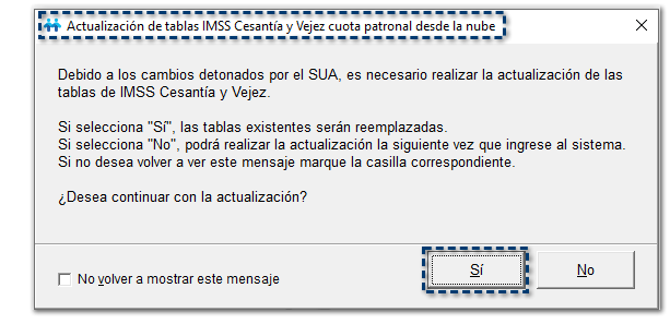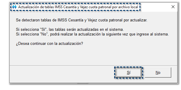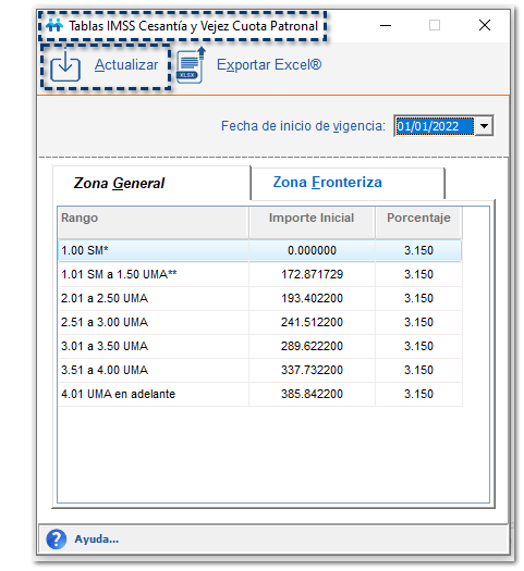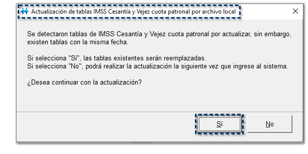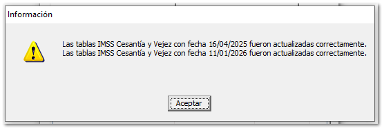 Después de realizar la instalación del sistema, la actualización de tablas se realizará al ingresar al sistema y desde el botón Actualizar en el módulo de tablas IMSS Cesantía y Vejez.