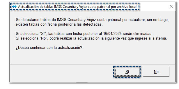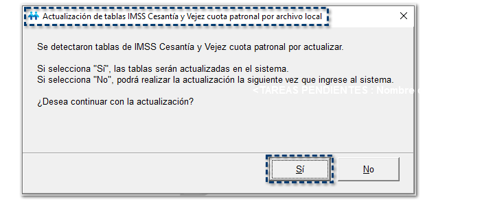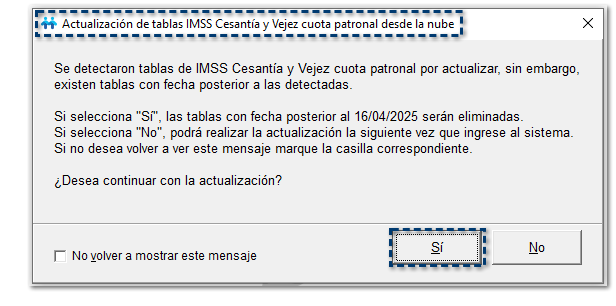 ¤ Al abrir el sistema y capturar tus credenciales de acceso, se mostrará un mensaje de actualización de tablas Cesantía y Vejez para indicar que se está validando una posible actualización.