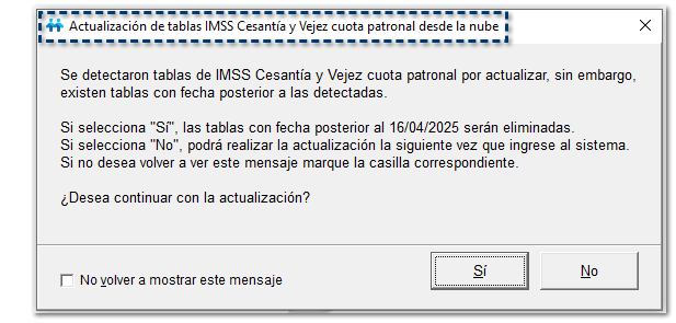 A partir de esta versión, se contará con una actualización automática de tablas IMSS Cesantía y Vejez cuota patronal al ingresar al sistema. También podrá accederse a la actualización de dichas tablas desde el menú Tablas\Tablas IMSS CyV Patrón por medio del botón Actualizar.