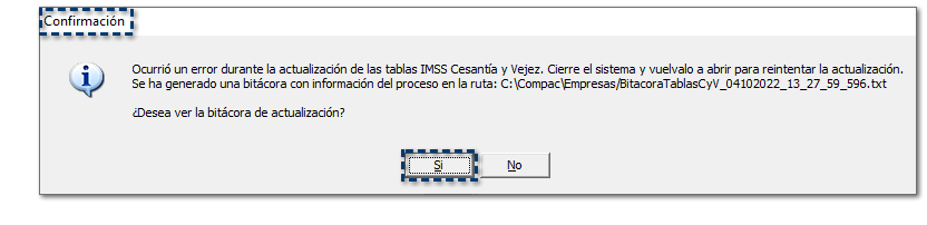 ![]() ¤ En caso de ocurrir un error durante el procesamiento, se escribirá en bitácora el error presentado y se mostrará una notificación para validar si se desea consultar la bitácora del proceso en ese momento:
