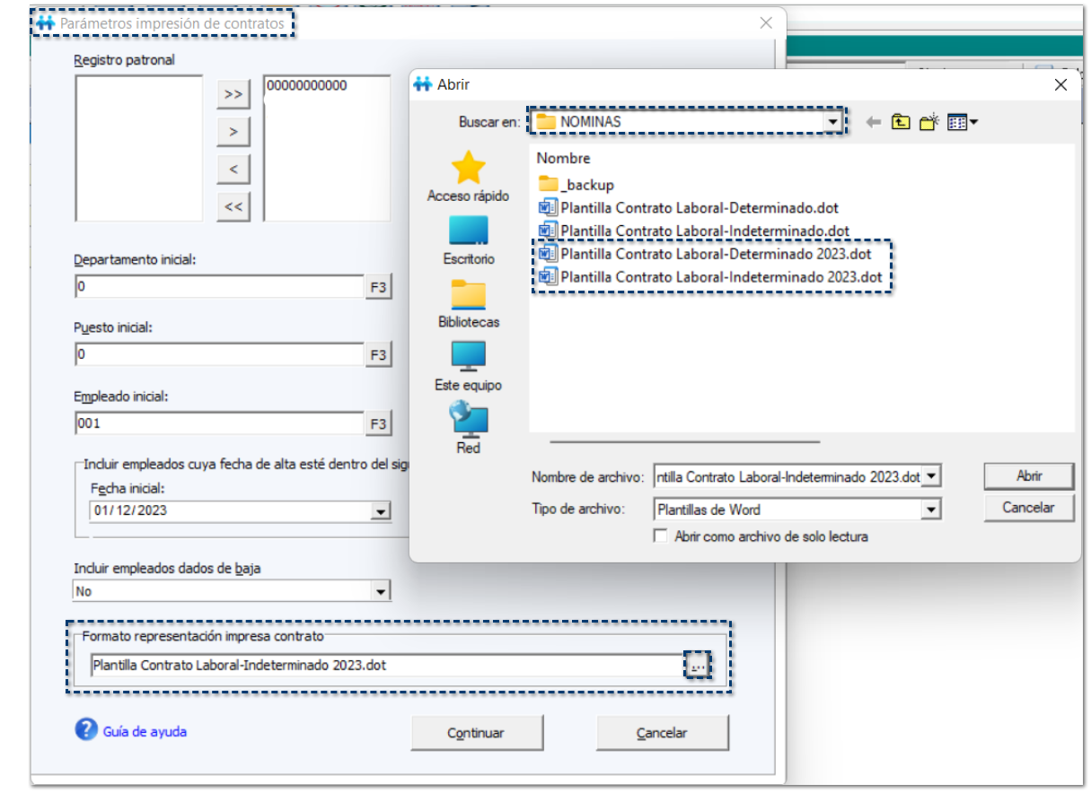 Al ingresar al menú Reportes, seleccionar el submenú Contratos y elegir la opción Impresión de contratos, dentro de la ventana Parámetros impresión de contratos, en la sección Formato representación impresa contrato, se agregan 2 nuevas plantillas con base la nueva Reforma LFT de vacaciones que entra en vigor a partir del 01/01/2023:
