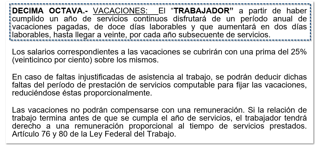 Se actualiza la clausula Décima Octava.- Vacaciones, indicando lo siguiente: