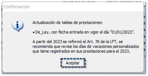 Se crearán las nuevas tablas personalizadas con la fecha de entrada en vigor del 01/01/2023, sin embargo, se visualizarán los valores que la empresa tiene definidos para las prestaciones que ofrece, por lo que, te recomendamos revisar los días de vacaciones personalizados y en caso de ser necesario, modificarlos con base a la nueva reforma de la LFT.