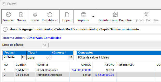 Recordemos que dicha empresa inició operaciones el 1º de diciembre del 2022, con aportación de capital social por $4,500,000 depositado a la cuenta bancaria de BBVA Bancomer, por lo que es muy importante que se registre la póliza de saldos iniciales para que se refleje la aportación que están realizando sus accionistas.