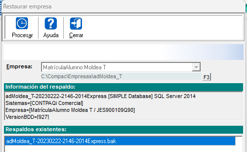 Recuerda que la carpeta adMatricula_Alumno Moldea T corresponde a tu matricula, la que capturaste cuando creaste la empresa de CONTPAQi® Comercial Premium.