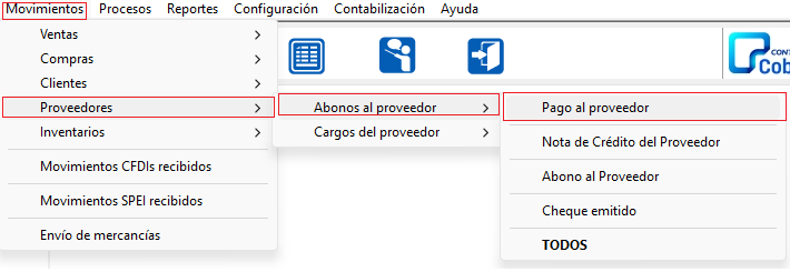 Ingresa al menú Movimientos/Proveedores/Abonos al proveedor/Pago al proveedor