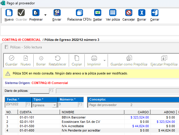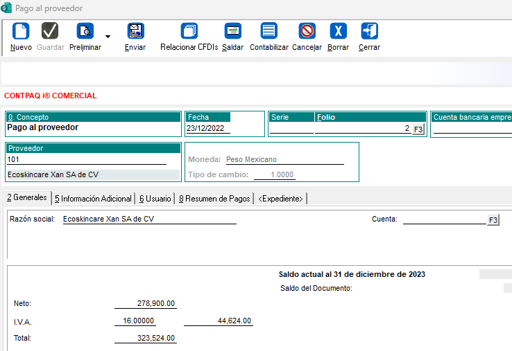 El 23 de diciembre de 2022 se hace una transferencia al proveedor Ecoskincare Xan SA de CV para liquidar la compra del 10 de diciembre.