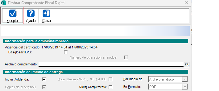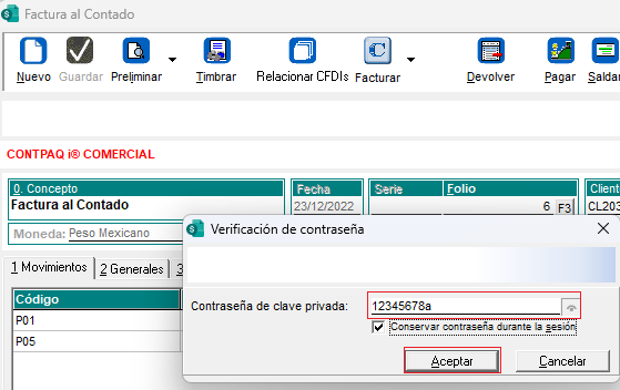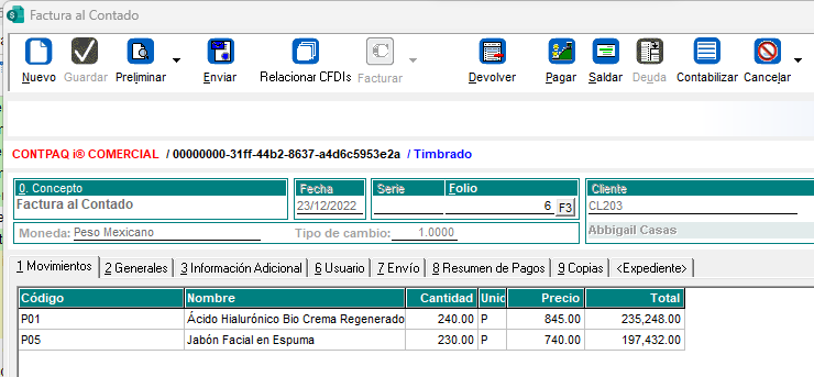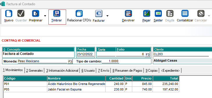 Captura la factura al contado y clic en el botón timbrar