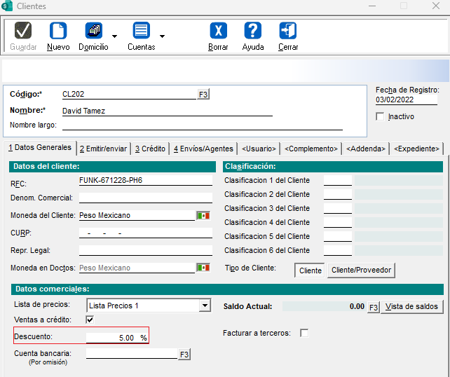 Verifica que al cliente se le tenga capturado el descuento del 5%: