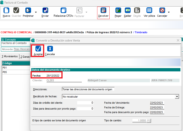 Clic en el botón Devolver, Captura la fecha del 28/12/2022 y Clic en Aceptar