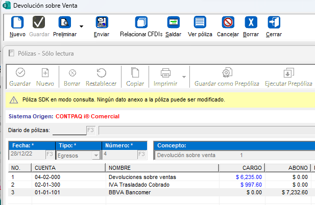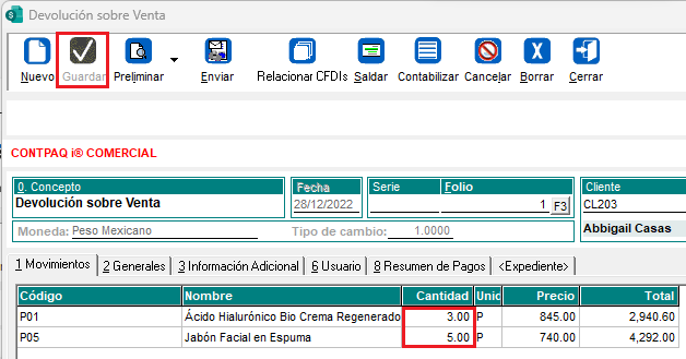 El 28 de diciembre del 2022, la cliente Abbigail Casas hace devolución de productos de la venta que Rodrigo Rojas le hizo el 23 de diciembre.