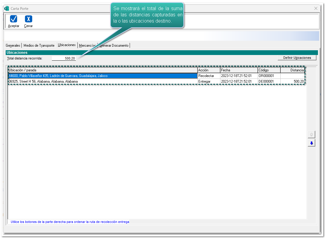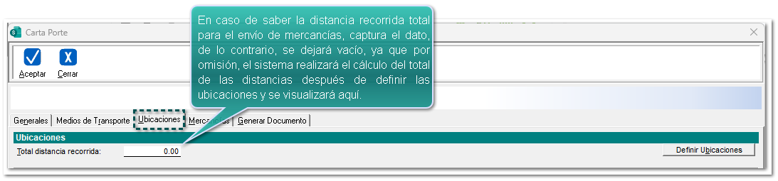 El campo Total distancia recorrida es acumulativa de acuerdo a las ubicaciones registradas, y podrá ser modificable manualmente, sólo se mostrará cuando se seleccione el medio de transporte "Ferroviario" o "Autotransporte", por lo que se registrará en kilómetros de la distancia recorrida entre la ubicación de origen y la de destino parcial o final, por los distintos medios de transporte que trasladan los bienes y/o mercancías.