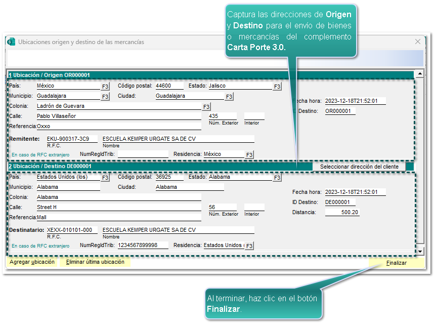 Posteriormente, se abrirá la ventana "Ubicaciones origen y destino de las mercancías" y captura la información correspondiente.