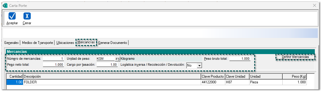 Dentro de la pestaña Mercancías, llena los datos correspondientes y haz clic en el botón Definir Mercancías.