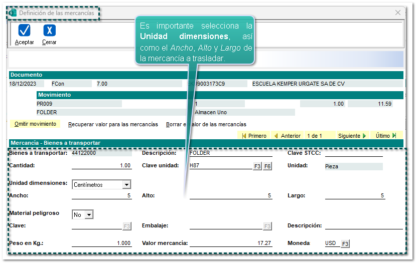Se abrirá la ventana "Definición de las mercancías" para poder llenar la información de las mismas: