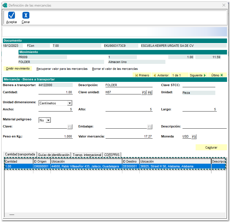 Al finalizar la captura de la ventana anterior, se mostrará la cantidad de los bienes y/o mercancías que se trasladan a través de las distintas ubicaciones.