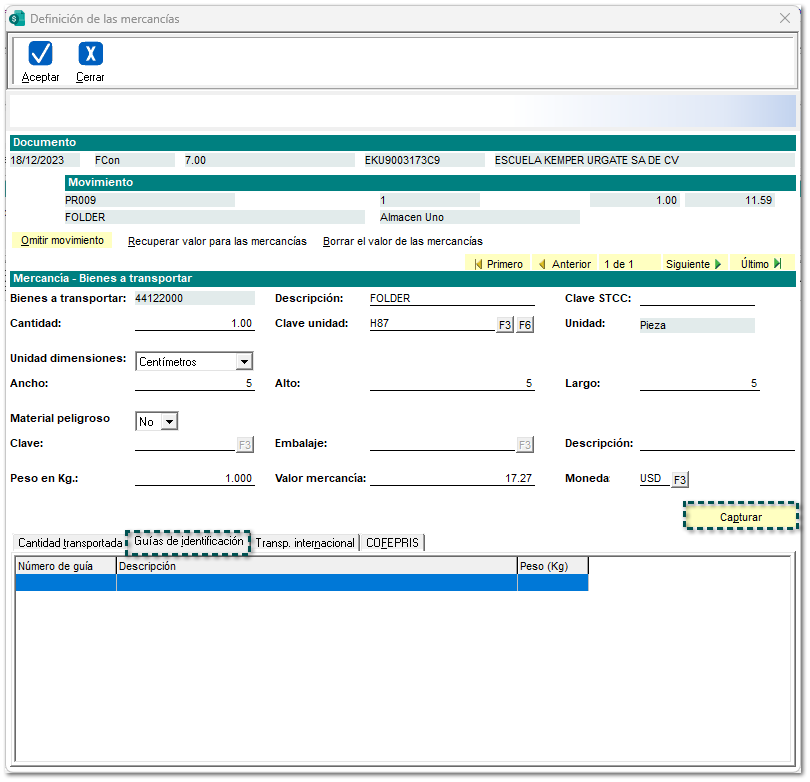 Para este ejemplo, para documentos tipo "Traslado", se tendrá que definir las Guías de identificación, haz clic en dicha pestaña y da clic en el botón Capturar: