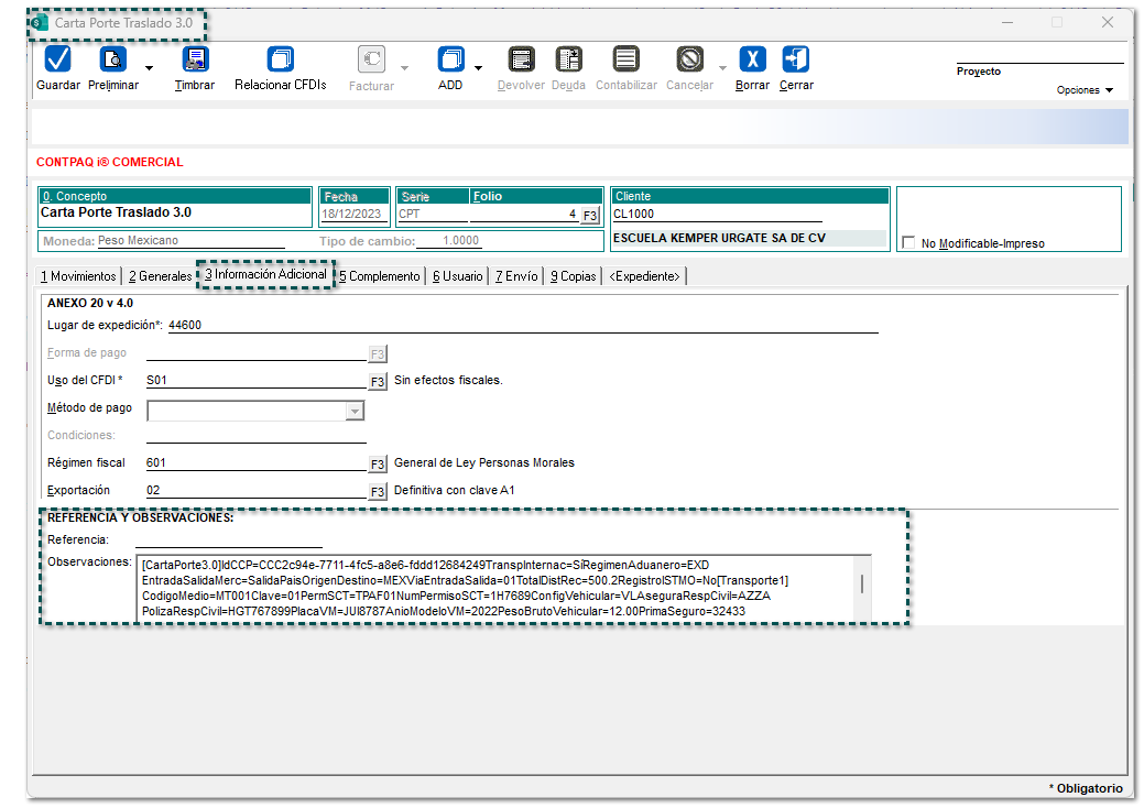 Se abrirá automáticamente el documento generado, y si lo deseas, podrás verificar los datos registrados en el proceso de captura para el complemento Carta Porte 3.0, para esto, ve a la pestaña 3 Información adicional, sección "REFERENCIA Y OBSERVACIONES":
