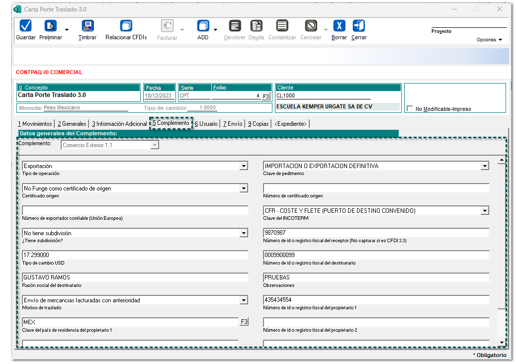 Accede a la pestaña 5. Complemento, y llena los datos del Complemento Comercio Exterior 1.1.