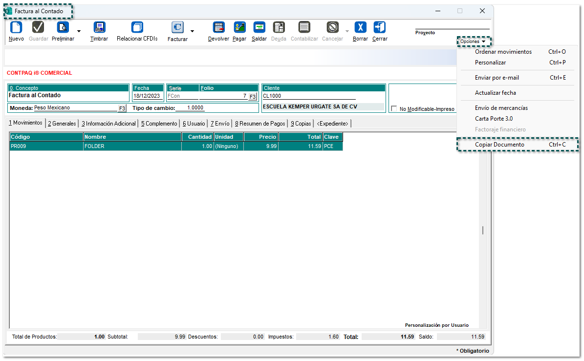Una vez seleccionado el concepto, elige a través del botón <F3> un Cliente el cual tenga configurado el Complemento Comercio Exterior 1.1.