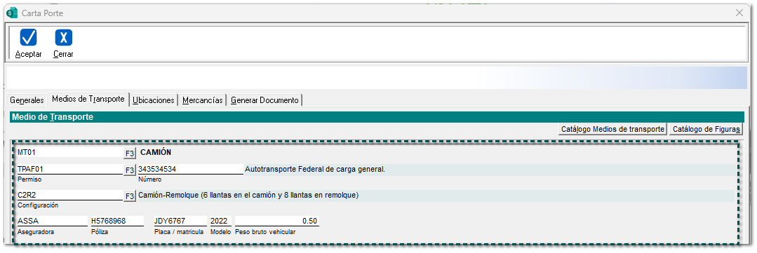 Verifica que la información del transporte se muestra automáticamente, y captura los datos faltantes de acuerdo al medio de transportación seleccionado.