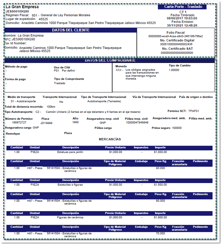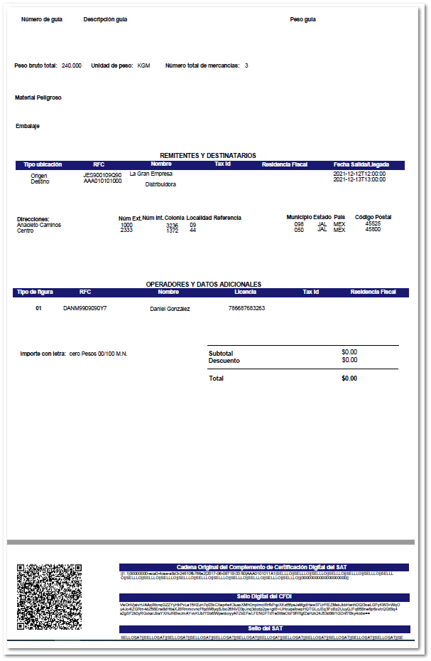 Ejemplo del Formato de impresión para un documento de Carta Porte versión 2.0 (Traslado) emitido por el propietario, en el que se muestra la información del complemento Carta Porte Autotransporte Federal.