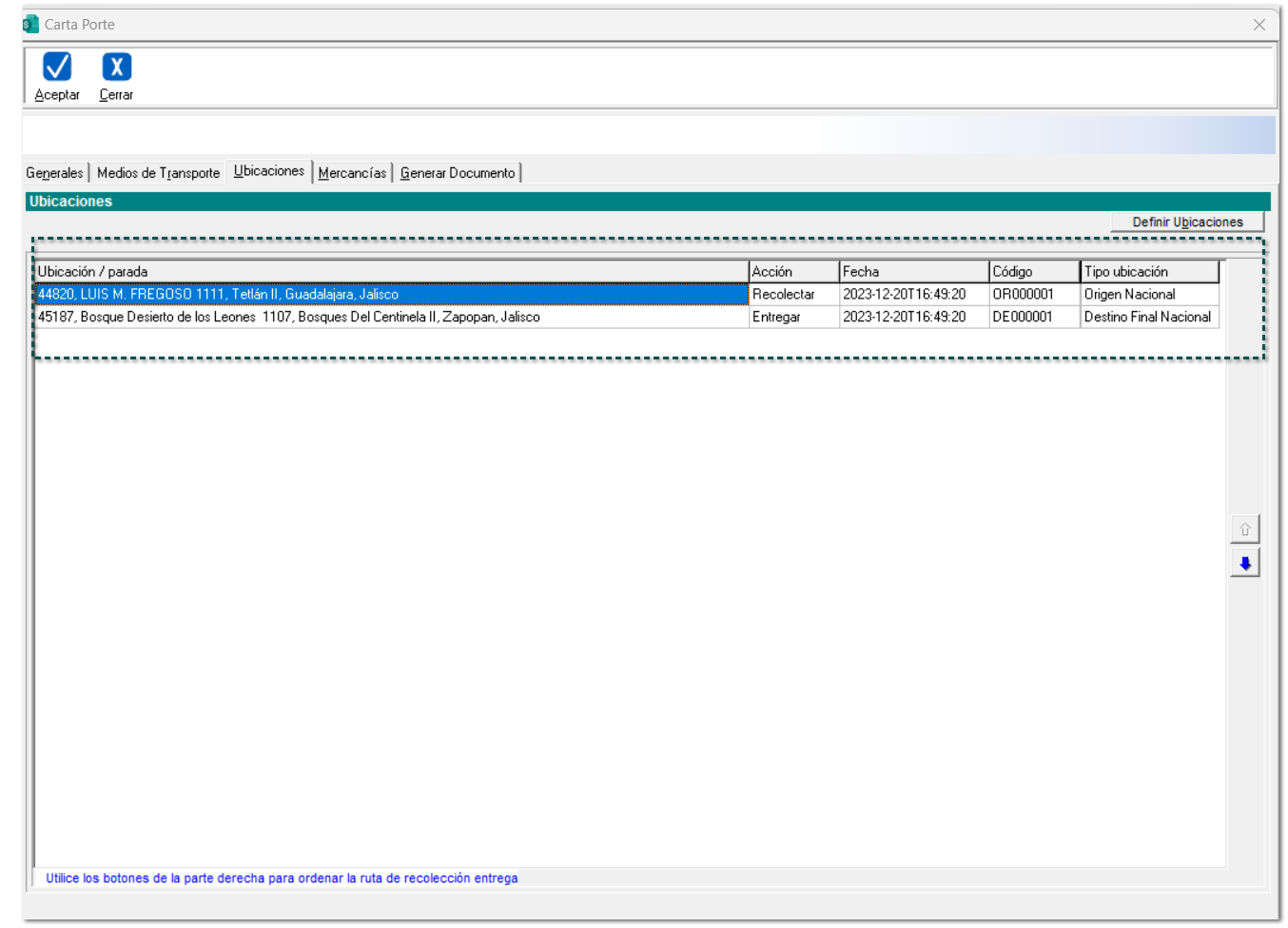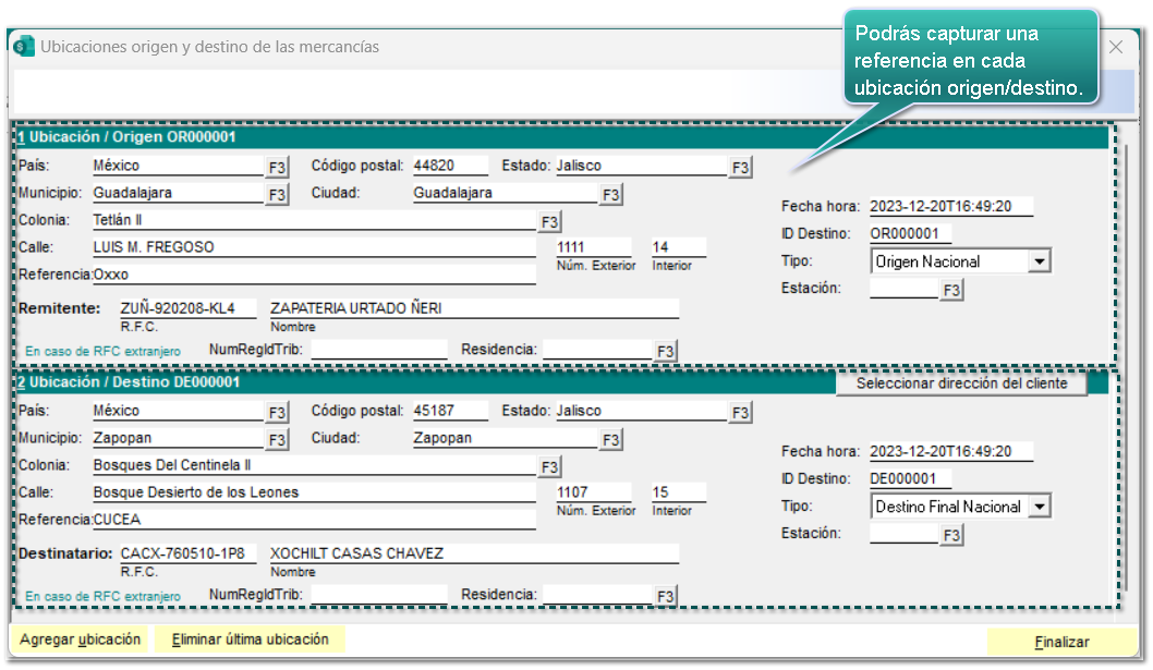 Posteriormente, se abrirá la ventana "Ubicaciones origen y destino de las mercancías" y captura la información correspondiente.