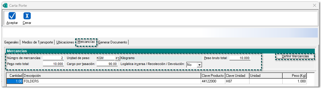 Dentro de la pestaña Mercancías, llena los datos correspondientes y haz clic en el botón Definir Mercancías.