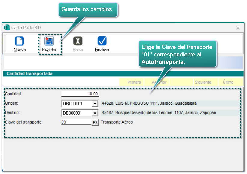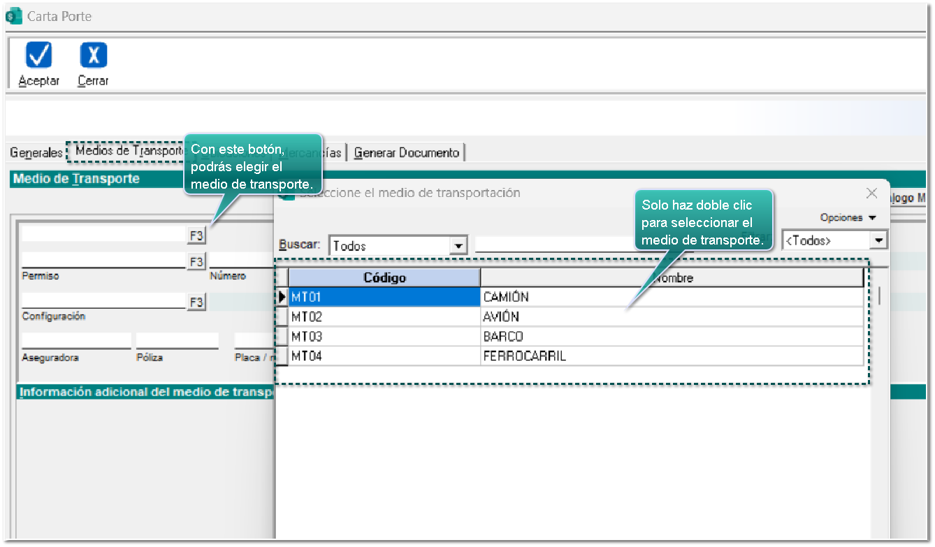 Verifica que la información del transporte se muestra automáticamente, y captura los datos faltantes de acuerdo al medio de transportación seleccionado.