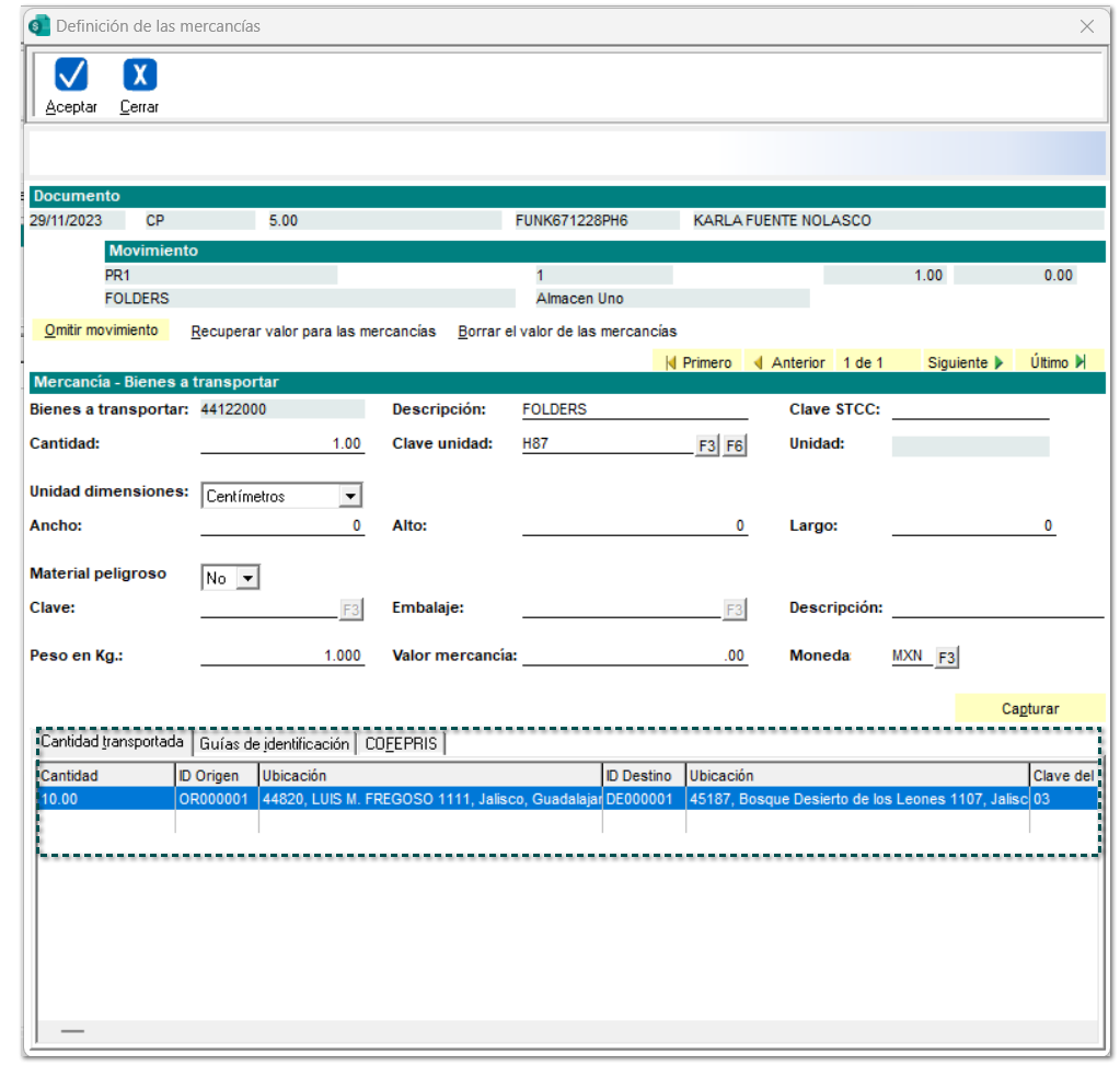 Al finalizar la captura de la ventana anterior, se mostrará la cantidad de los bienes y/o mercancías que se trasladan a través de las distintas ubicaciones.