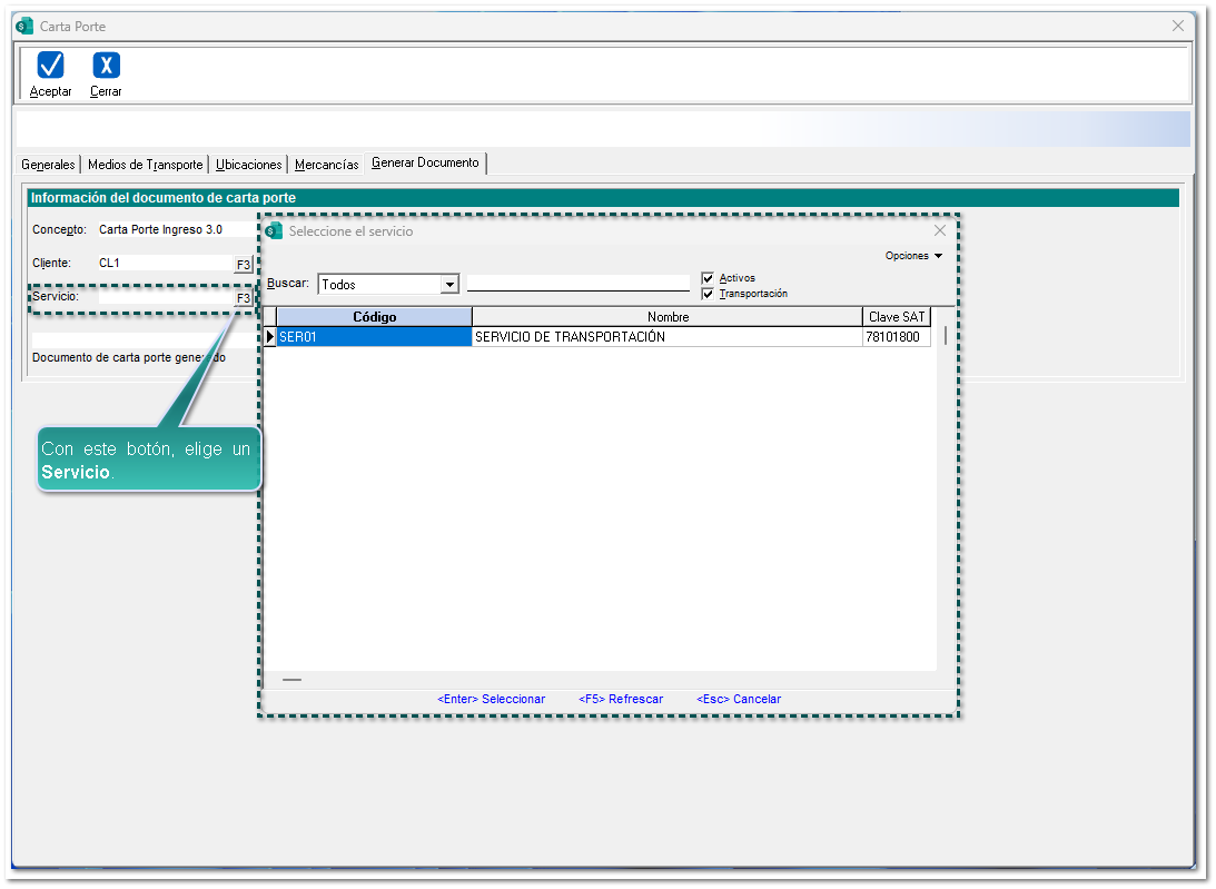 Una vez seleccionado el concepto, elige a través del botón <F3> un Servicio de transportación para el envío de la mercancía.
