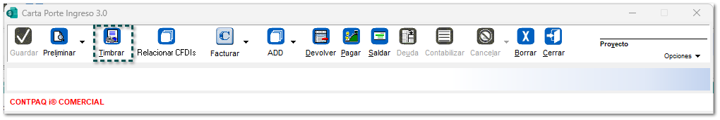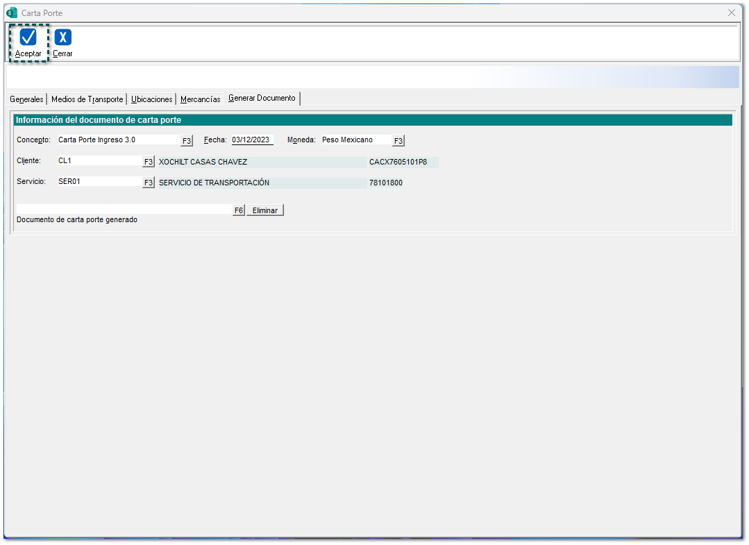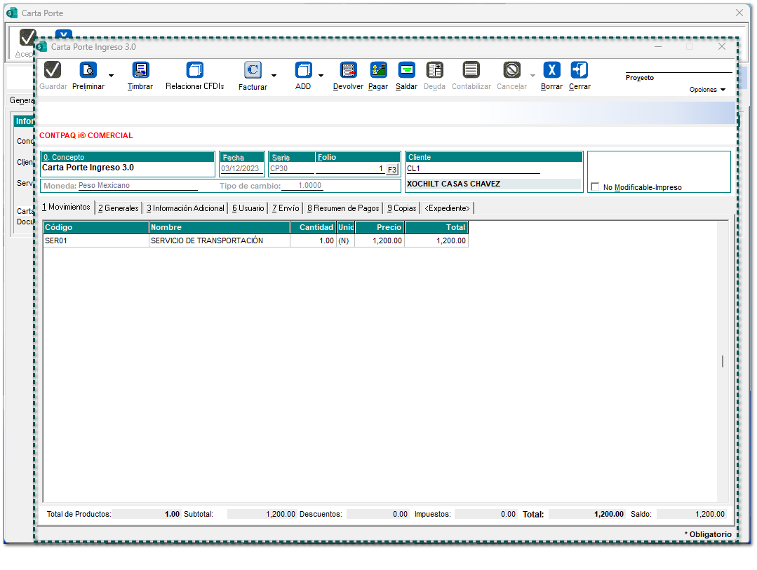 Dentro de la ventana del proceso, se mostrará el documento Carta Porte tipo Ingreso creado.