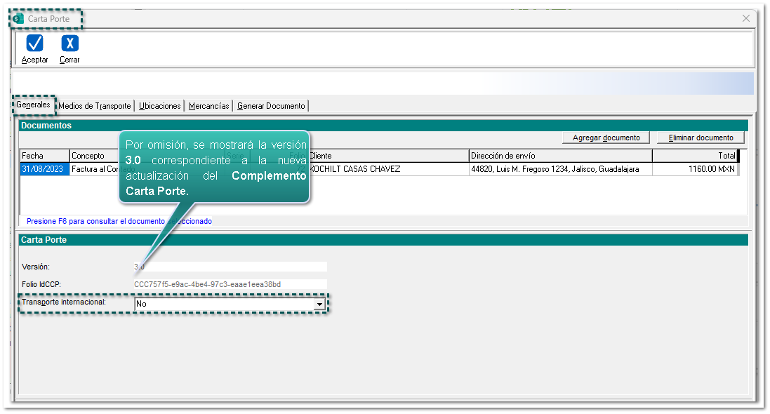 Dentro de la ventana Carta Porte, pestaña "Generales" agrega un documento. O bien, si ingresaste a la opción "Carta Porte 3.0" desde un documento, se mostrará el documento seleccionado.