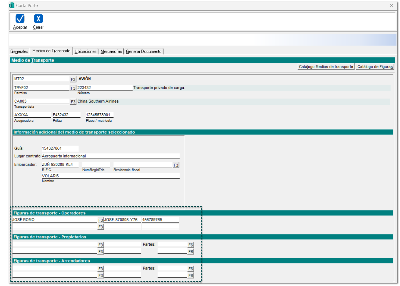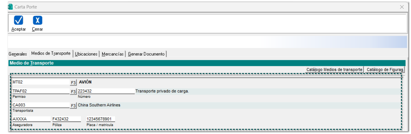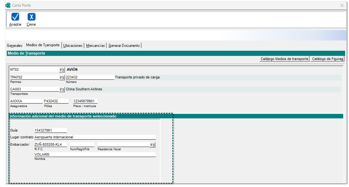 En este ejemplo, se asignará el medio de transporte "Aéreo" en el proceso de captura del complemento Carta Porte versión 3.0, generando un documento de tipo Ingreso.