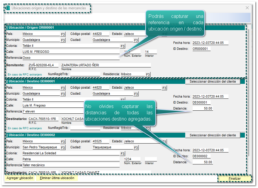 Posteriormente, se abrirá la ventana "Ubicaciones origen y destino de las mercancías" y captura la información correspondiente.