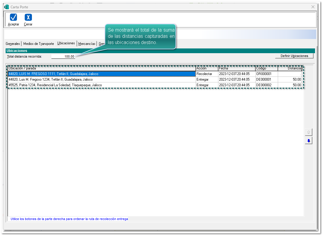 El campo Total distancia recorrida es acumulativa de acuerdo a las ubicaciones registradas, y podrá ser modificable manualmente, sólo se mostrará cuando se seleccione el medio de transporte "Ferroviario" o "Autotransporte", por lo que se registrará en kilómetros de la distancia recorrida entre la ubicación de origen y la de destino parcial o final, por los distintos medios de transporte que trasladan los bienes y/o mercancías.