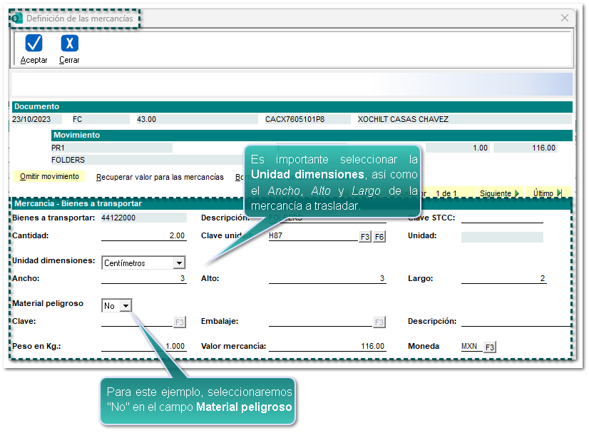 Se abrirá la ventana "Definición de las mercancías" para poder llenar la información de las mismas: