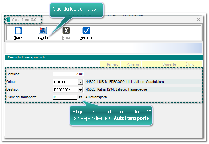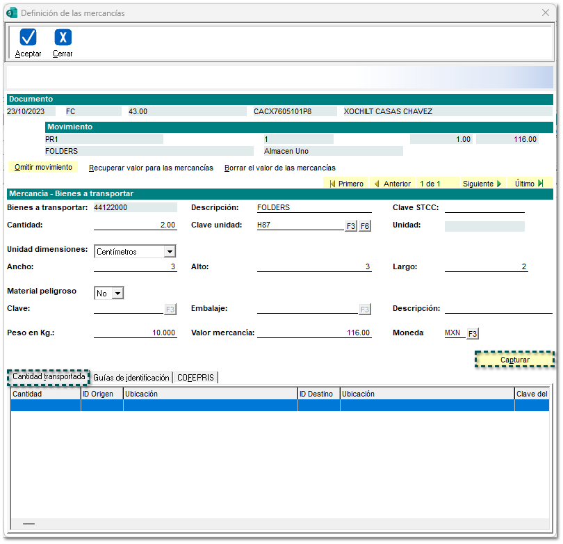 Posiciónate en la pestaña "Cantidad transportada" y haz clic en el botón Capturar.