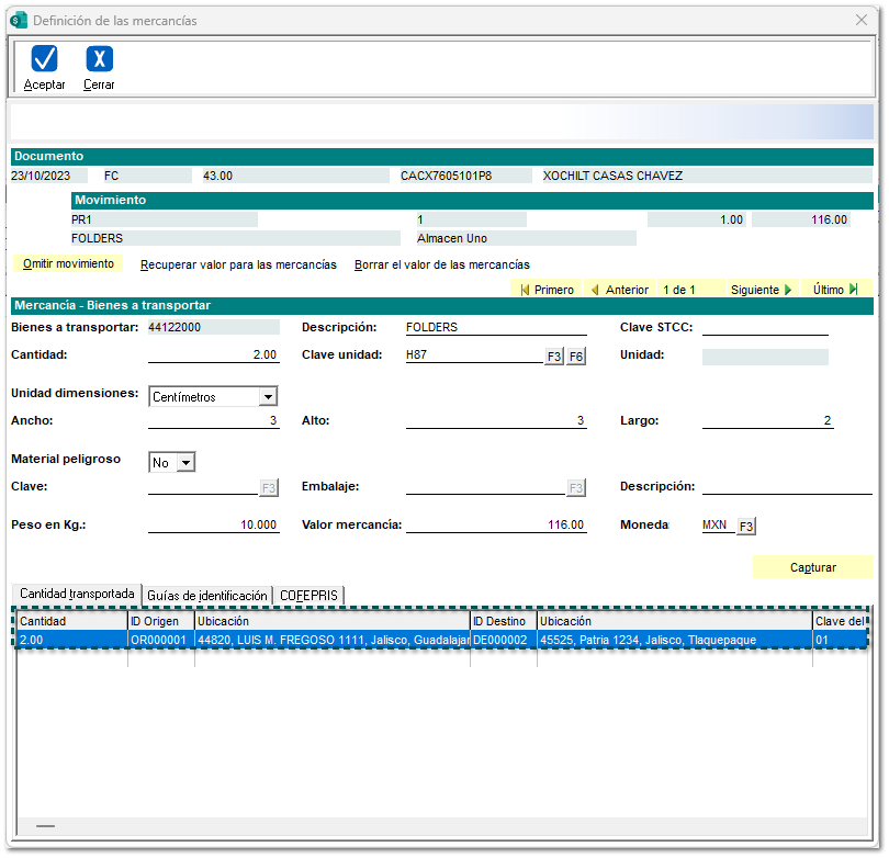Al finalizar la captura de la ventana anterior, se mostrará la cantidad de los bienes y/o mercancías que se trasladan a través de las distintas ubicaciones.