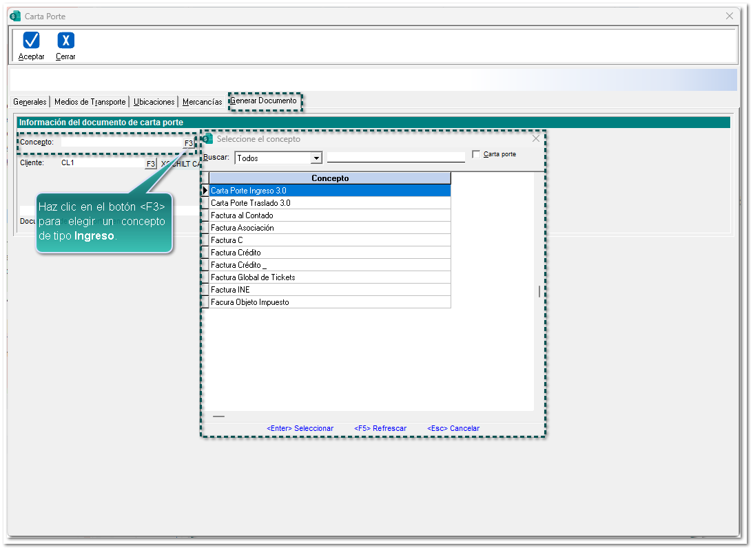 En la pestaña Generar documento, selecciona mediante el botón <F3> un concepto para la generación del mismo.