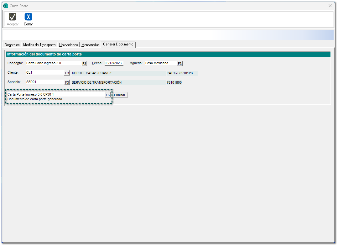Dentro de la ventana del proceso, se mostrará el documento Carta Porte tipo Ingreso creado.