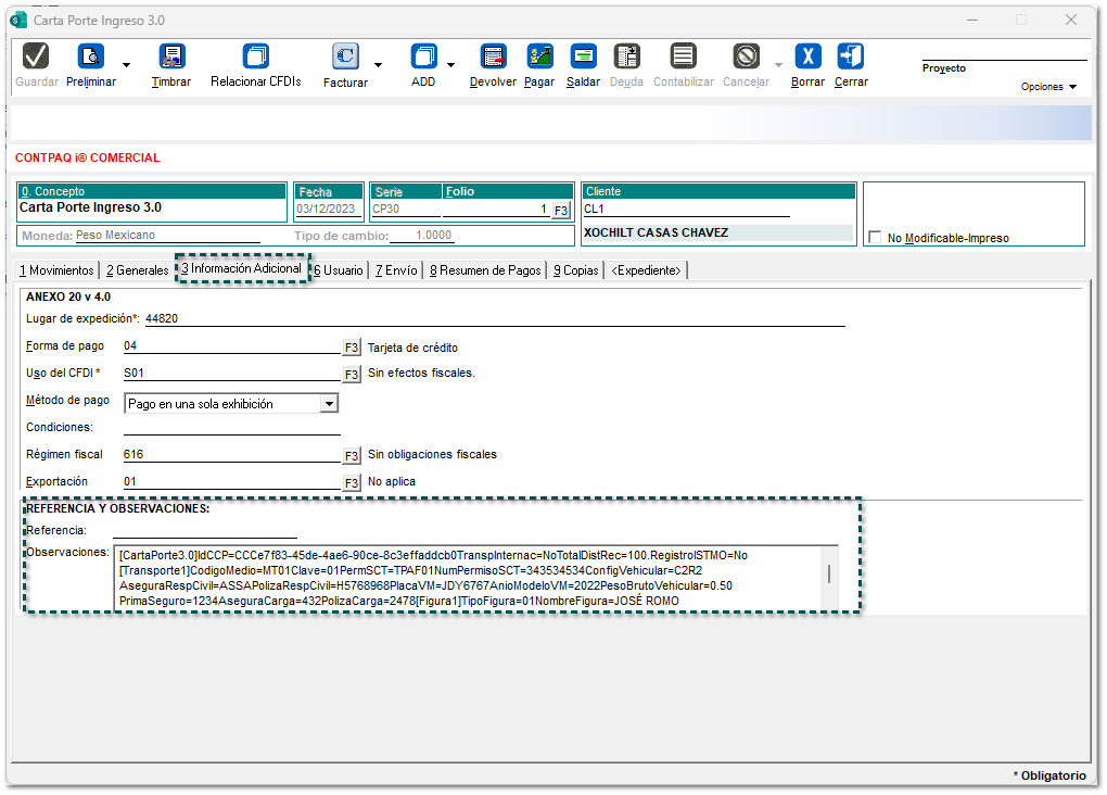 Si lo deseas puedes verificar los datos registrados en el proceso de envío de mercancías, para esto, ve a la pestaña 3 Información adicional, sección "REFERENCIA Y OBSERVACIONES":
