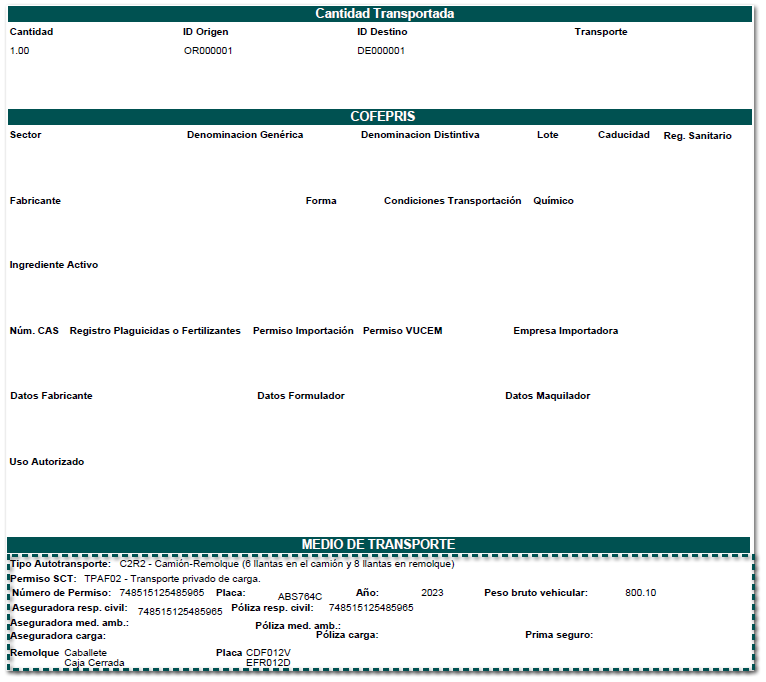 Verifica que la información del transporte se muestra automáticamente, y captura los datos faltantes de acuerdo al medio de transportación seleccionado.