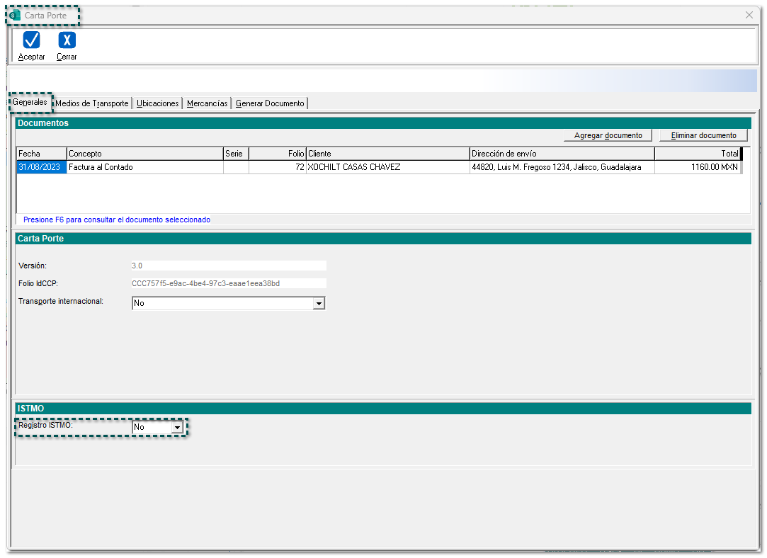 Dentro de la ventana Carta Porte, pestaña "Generales" agrega un documento. O bien, si ingresaste a la opción "Carta Porte 3.0" desde un documento, se mostrará el documento seleccionado.