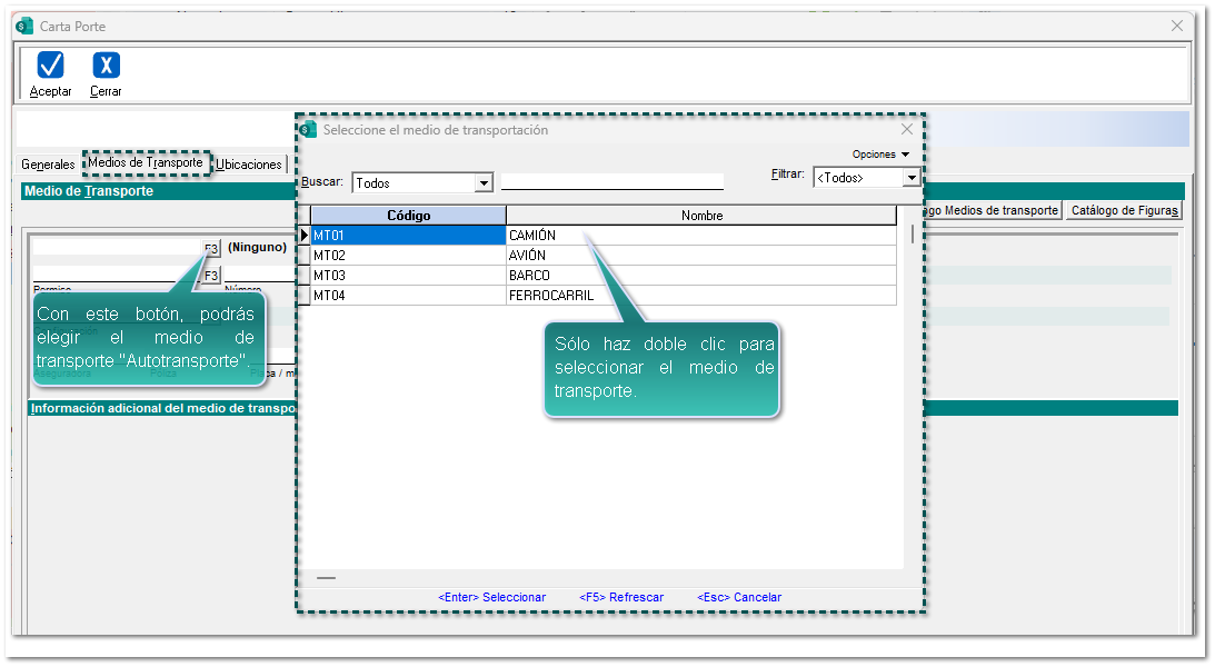 Haz clic en la pestaña Medios de transporte, elige a través del botón <F3> un tipo de medio de transporte "Autotransporte".