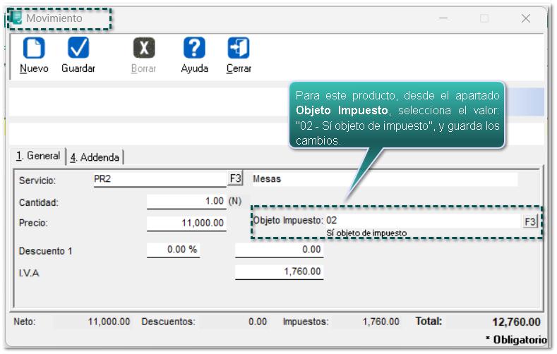 Desde el movimiento, agrega un producto con su "Cantidad" y "Precio" correspondiente: