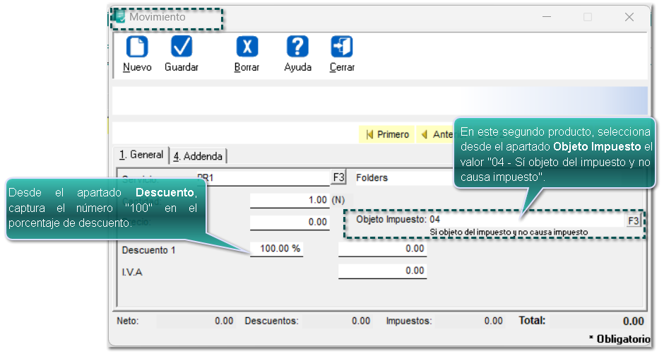 Genera un concepto en el cual vas a facturar, y configura desde la pestaña 3. Impuestos y descuentos el campo Descuento, como "Escritura", para que puedas capturar el porcentaje de descuento del 100% requerido para un producto.
