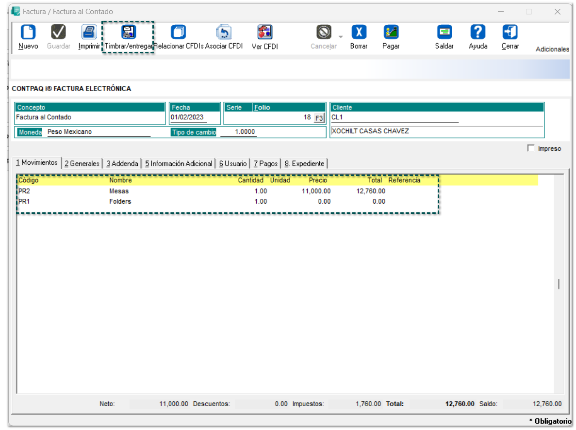 La empresa "ZAPATERIA URTADO ÑERI" facturará dos productos con la versión 4.0 del Anexo 20 al cliente "XOCHILT CASAS CHAVEZ", los cuales, uno de ellos tiene un 100% de descuento (IVA 0%), por adquisición del primer producto con precio normal.
