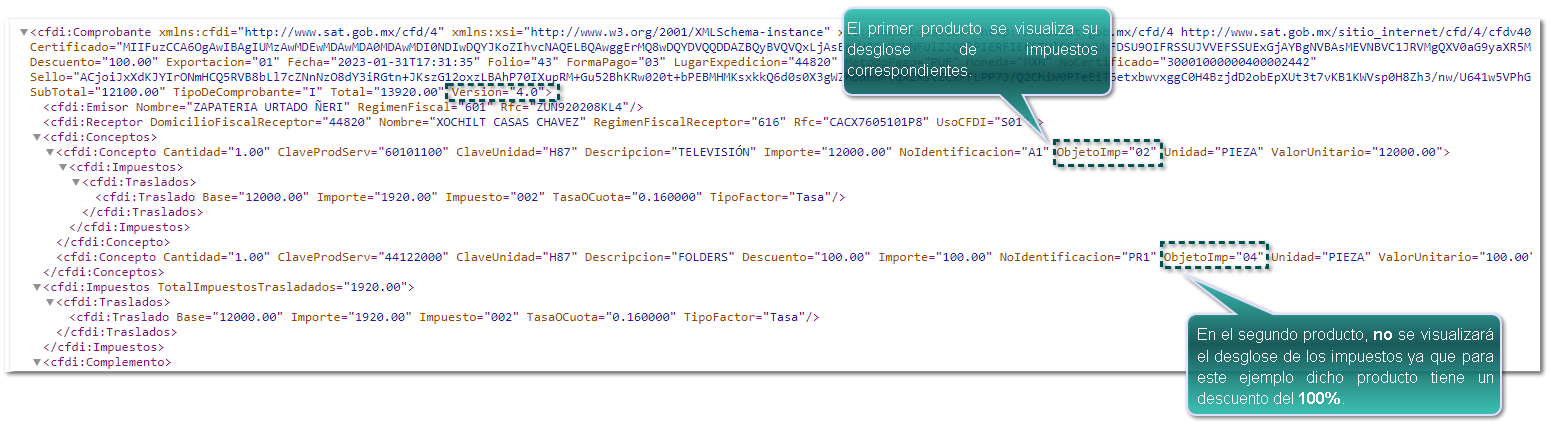 Es decir; que en cualquier otro caso como el valor: “01 – No objeto de impuesto”, “03 - Si objeto de impuesto y no obligado al desglose” o “04 – Sí objeto de impuesto y no causa impuesto”, el nodo impuestos no debe existir dentro del XML.