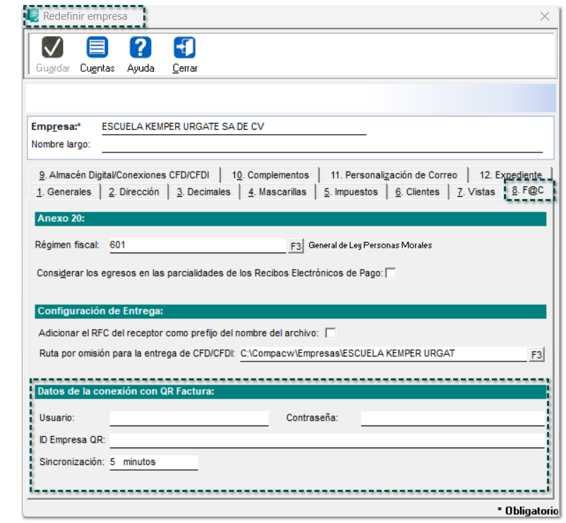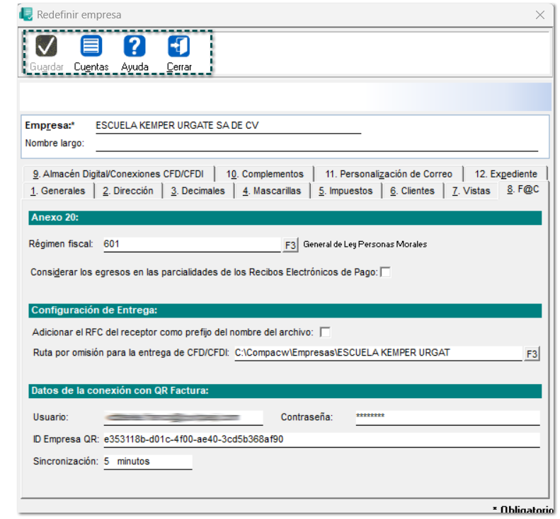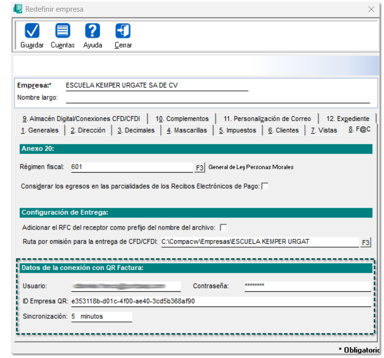 Localiza los datos de conexión con QR Factura y captura los datos usuario, contraseña y ID Empresa QR.